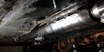 It's been a rough couple of weeks at work (70-80 hours), but I managed to get some garage time in. The exhaust installation is complete. It came out pretty good, but I had the usual surprises. The FWD Performance kits really like the passenger side. The exhaust on both the Daytona and CSX had about 1/2" too much length between the two 90 degree bends, which pushes the cat up against the heat shield from the back. I had to remove that amount from both, but I had to cut that pipe anyway to swing the back half up a bit. It's clamped for now, but I will weld it once I'm happy with how the exhaust has settled in its hangers. Add to that the 3" down pipe, which doesn't have enough length before the last curve and the cat ends up rubbing the heat shield. Some heat shield massaging was needed to clear it. The missing down pipe heat shield required that I wrap the down pipe in header wrap and shield the shifter cables a bit. The offset oval muffler simplified the cutting/fitting behind the muffler, since I could use the offset to drop the tail pipe. That part worked out well.