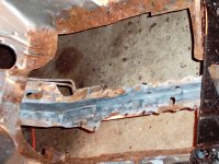 Progress has been slow but steady on the floorpans. The passenger side is welded back in. I ended up getting a MIG welder, as it is the only way to do sheet metal (short of TIG). It definately makes the job much easier and better-looking than trying to do it with a stick welder (less cleanup). I did get one of those stitch welders off of eBay for $20. For stick welding small stuff, it really does help. The rod doesn't stick to the piece and you don't have to worry so much about burn-though. Before welding the plates in, I painted the frame rail and the bottom of the plates with POR-15 Chassiscote Semigloss Black. I have had good luck with POR-15 in the past, but this will be the real test. Obviously, I had to take a wire wheel to the places that I welded the plates to the frame because the paint was burned away. I will go back and touch those up. Also, I won't be using the semigloss stuff again. The finish is very random with using a brush to apply it. Spraying it probably works better.