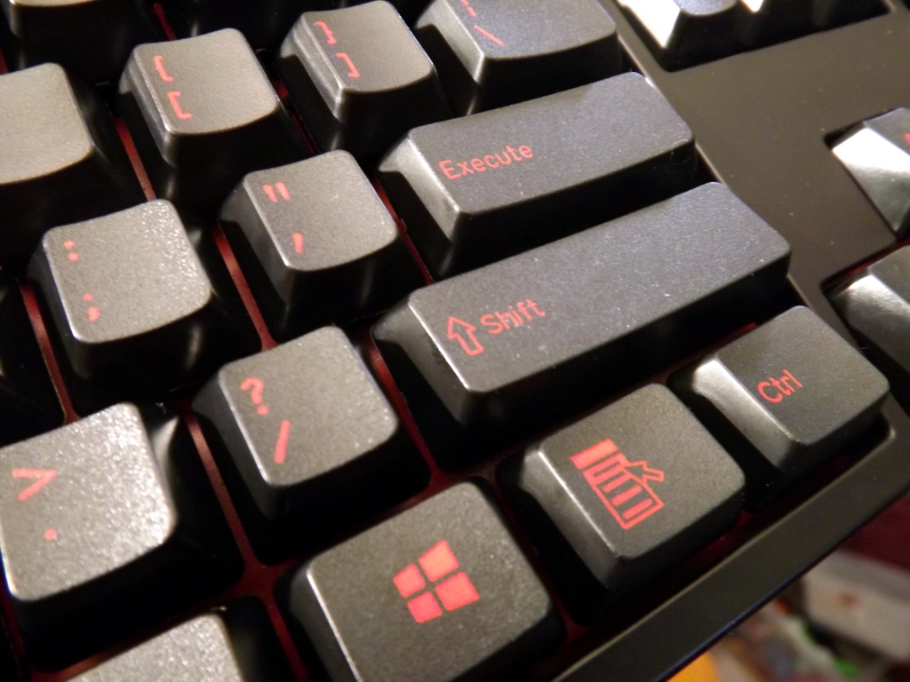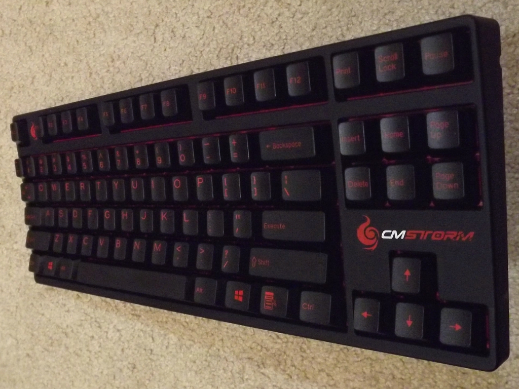 This is the CM Storm Quick Fire Rapid with Cherry MX red switches sporting double-shot "Ragnarok Red" key caps from signature plastics. Much better than the gaudy caps it comes with. They have more texture to them, too.