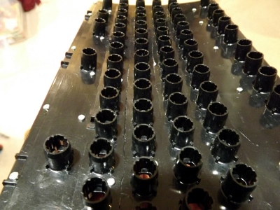 One of the Model M failures that is harder to deal with is cracking of the plastic plate that contains all of the key cap cylinders. Unicomp refers to this as the keyboard "frame". Severe cracking is usually caused by extended use with broken rivets and/or severe abuse. Between each row are channels where the plastic is thin so that the frame can follow the contour of the backplate. The plastic gets brittle over time and will crack along these channels.