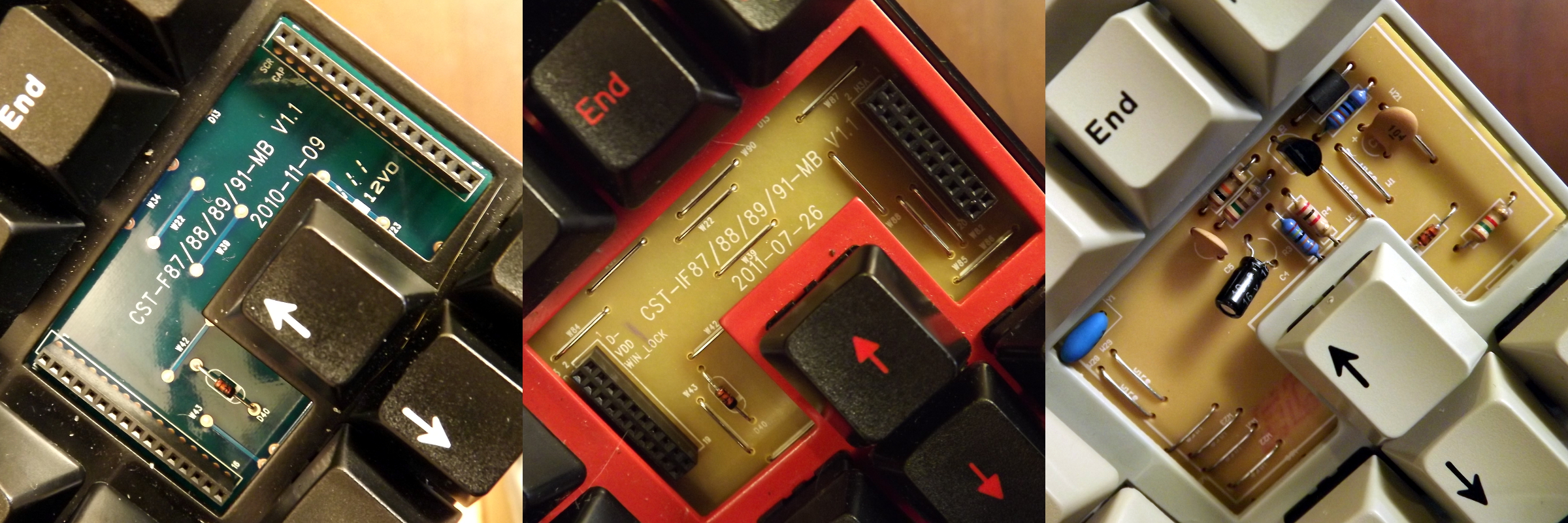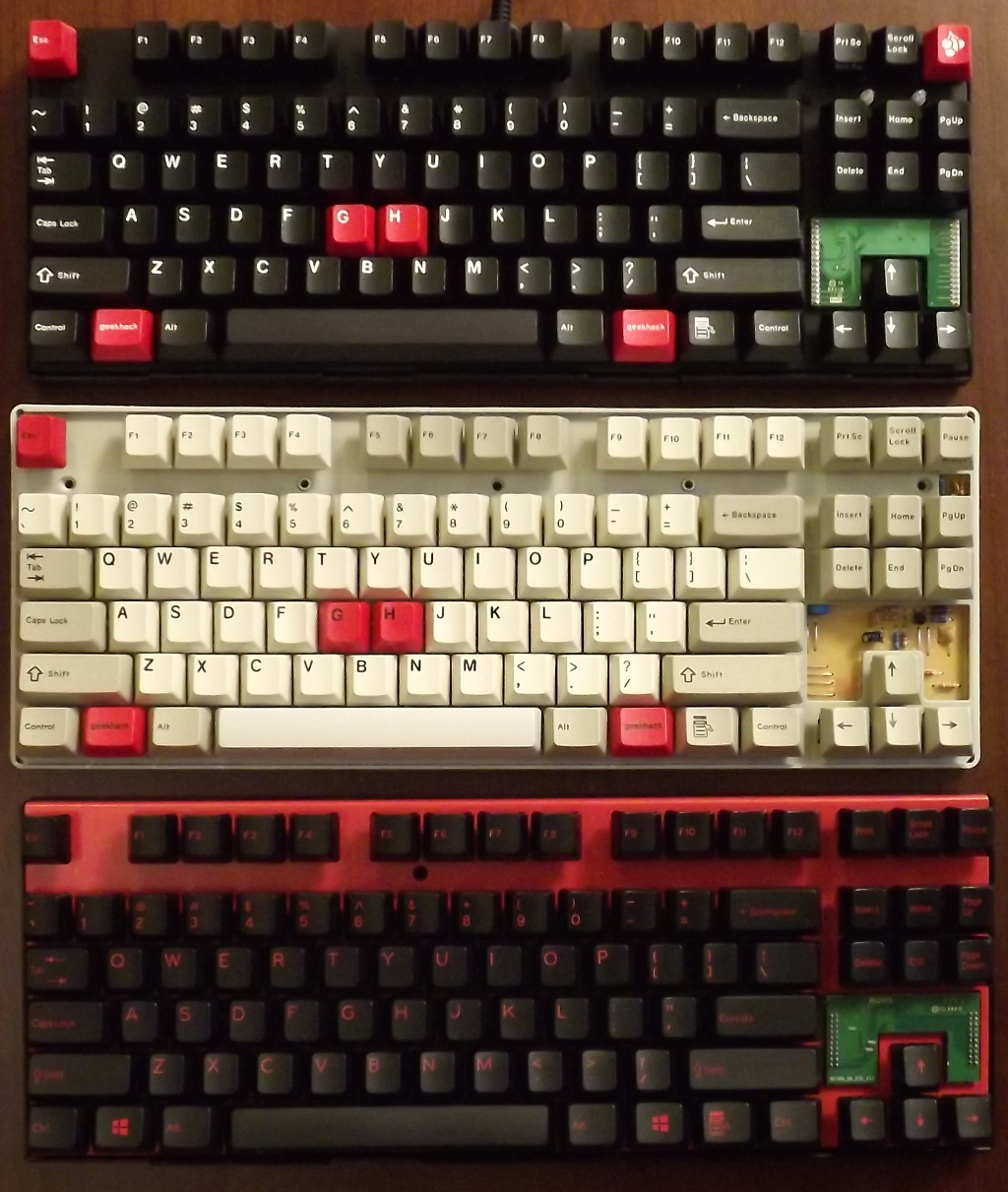 The QFR and the Leo use a single-sided FR2 ~0.06" PCB while the Filco uses a double-sided FR4 0.065" PCB. The MJ2 and QFR both use a header-mounted controller (though not compatible) while the Leo has the controller built onto the main PCB. The slightly thicker and denser PCB material on the FJ2 is the only major thing that sets it apart from the other two.