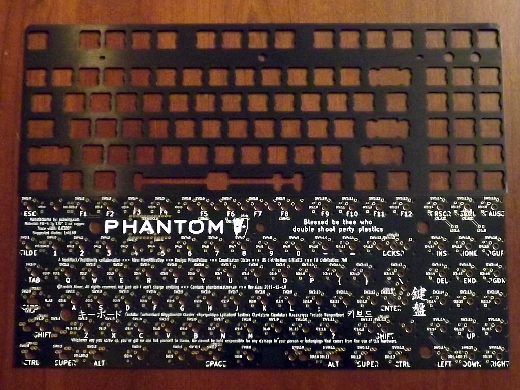 The Phantom keyboard is a community-driven keyboard project. The goal was to build a tenkeyless mechanical keyboard with customizable firmware that would fit into a Filco or similar case. The keyboard controller is a Teensy 2.0 and the key switches are Cherry MX. This build uses lubed "ergo-clear" switches and is mounted in an acrylic case from Litster on GeekHack. The key caps are double-shots from a Cherry G80 with a few novelty keys from the Cherry Replica project.