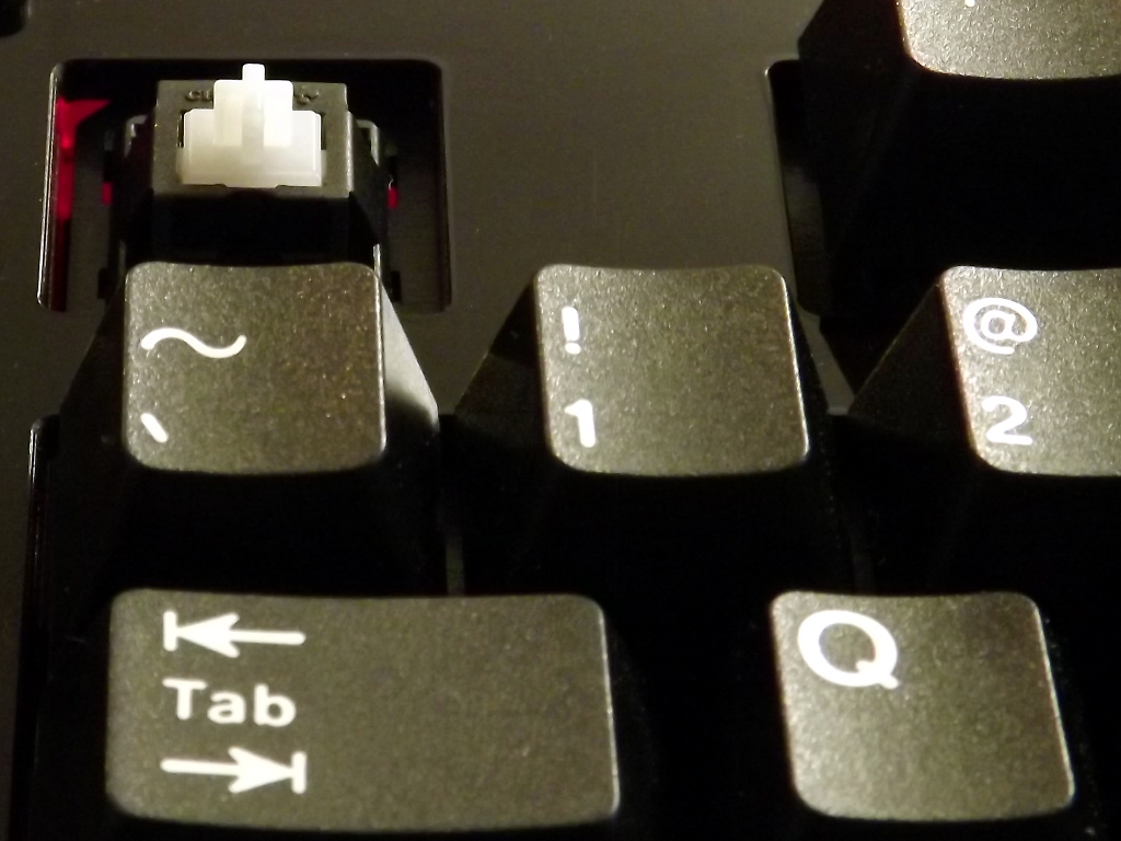 The Cherry MX switch lineup is somewhat lacking a "quiet" tactile switch that is really tactile. As a buckling spring enthusiast, I find the MX blue switches highly annoying both in terms of sound and feel. The click has a very high-pitched tick and ring to it and the tactile feel has an odd disconnect from the time the key is registered. This might be because the reset point is above the actuation point. MX brown switches are not really all that tactile to begin with, but at least they register the press at a more intuitive moment and they don't have that annoying tick. Cherry also has a more tactile version of their brown switch, which has a translucent "clear" stem. The springs are quite stiff, which makes them tiring to type on for any length of time.