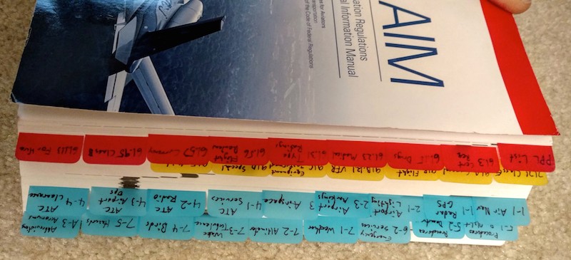 There is a suggested study list at the beginning of the FAR/AIM that helps narrow the focus when seeking a particular license. However, I found that the private pilot list tended to skip things that are important enough to be covered in other materials I have seen. I used it as a rough guide to make sure that things were OK to skip, rather than as a definitive study list. As you can see, I used those Post-It tabs to mark those sections plus others that I deemed important.