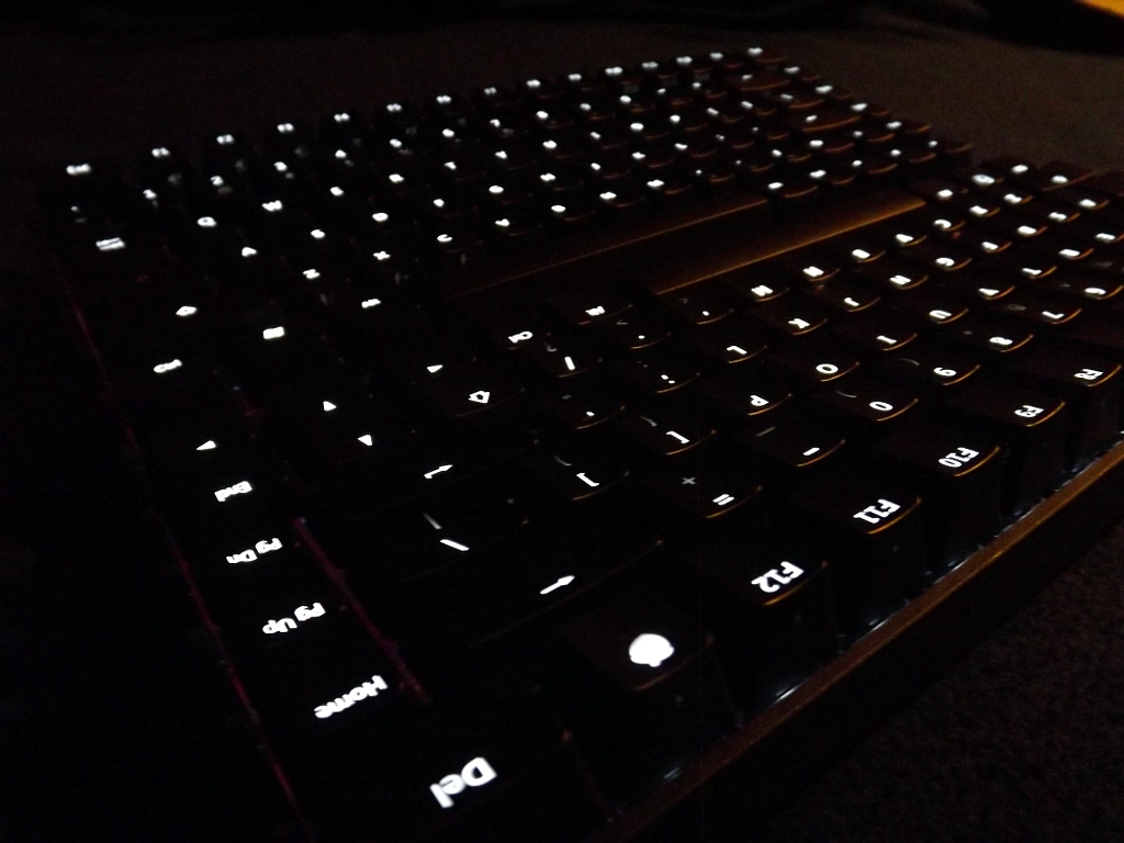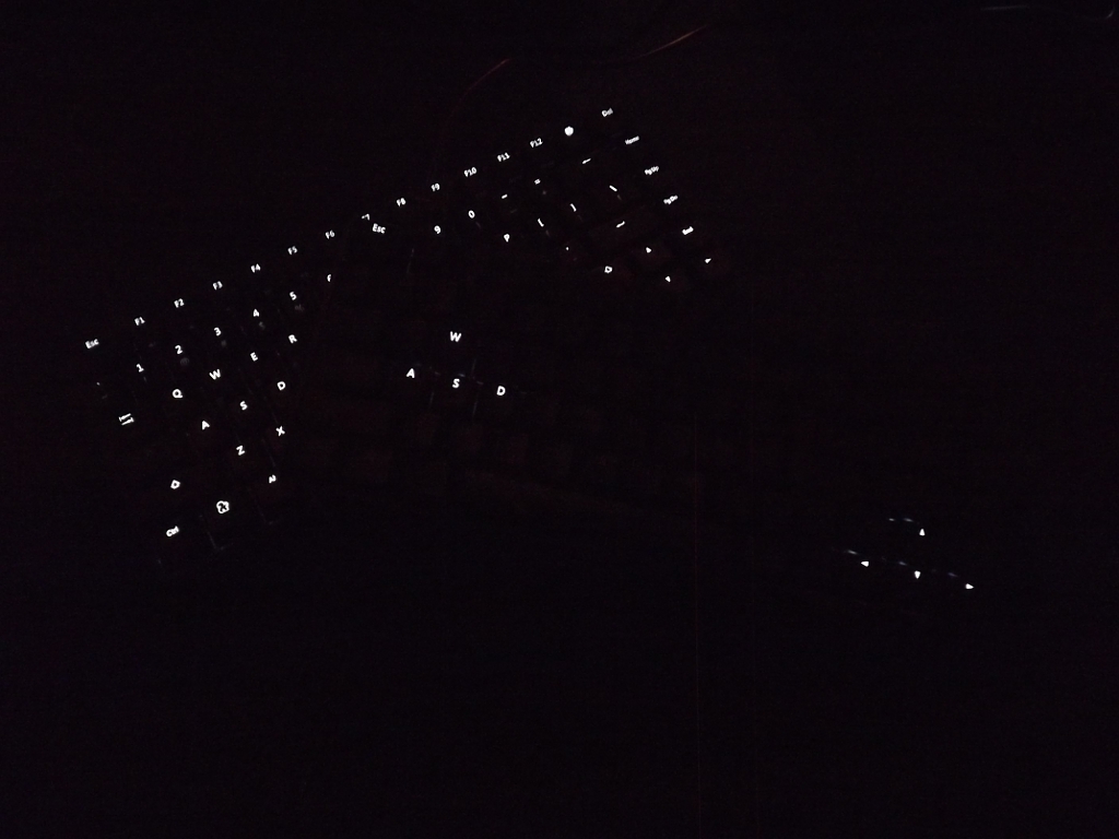 Here is the back lighting in action. It lets you set the brightness and lighting mode. One lame thing is that it forgets all the settings whenever it is reset. Another disadvantage is that it uses non-standard key cap sizes and profiles. So even if you give up the back lighting, you can only get other cap sets from Vortex. Vortex is a poorly-run company and I recommend avoiding working directly with them. Getting these turned into a bit of a mess over on GeekHack. The best thing is to buy them from a retailer that has them physically in stock.