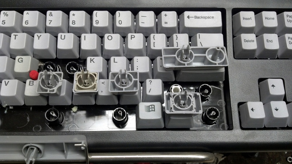One of the Model M failures that is harder to deal with is cracking of the plastic plate that contains all of the key cap cylinders. Unicomp refers to this as the keyboard "frame". Severe cracking is usually caused by extended use with broken rivets and/or severe abuse. Between each row are channels where the plastic is thin so that the frame can follow the contour of the backplate. The plastic gets brittle over time and will crack along these channels.