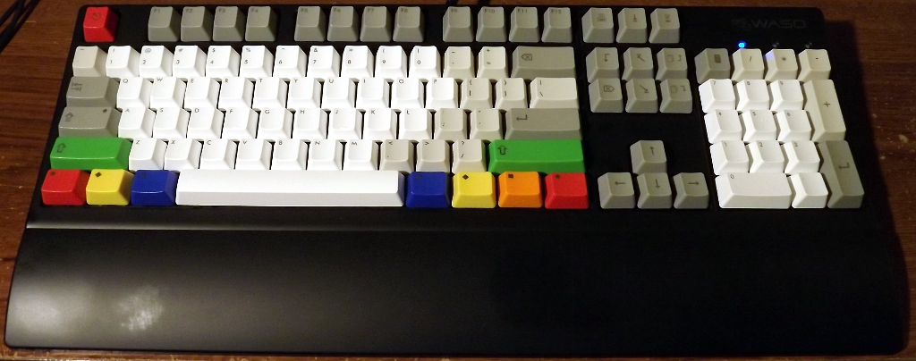 I used their custom keyboard designer, which allowed me to customize the colors and legends of the ABS laser-etched keys. They can also laser-engrave, which I did on the WASD cluster (very helpful, BTW). I went with all symbols on the modifiers. Unfortunately, they were out of dark-gray 1.25 unit modifiers at the time. I did the RGBYO thing, instead. A bit gaudy, but whatever. The Futura font is nice.