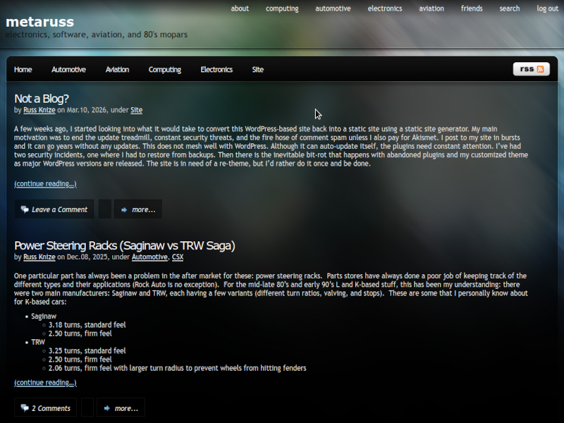 After a few halfhearted attempts, I finally bit the bullet and exported the site out of the clutches of WordPress into the clutches of a static site generator called Eleventy. It took a few weeks to get everything cleaned-up and functional, but as of 2026 the site is static again. The goals were mainly to reduce maintenance overhead and implement a return to form against the tide of Internet walled gardens. An SSG seems to be the happy medium between directly editing HTML and running a dynamic website. The published output acts like a CMS and can be themed like one, but it's all static. This also simplifies the backend: no databases or scripting engines are required, closing a number of attack vectors.
