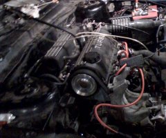 It's alive!!! Frankentona lives again! Got the motor all hooked up tonight, pressurized the fuel system, and checked for leaks. Stared at it for a minute to make sure I didn't forget anything really important and cranked it over. It fired right up on the first try. I was a little surprised, given the major harness surgery it underwent in the engine bay. It was smoking pretty good from all the oil and grease on the exhaust/turbo, but it didn't really show up in the picture. Before test firing it but after putting oil in it, I primed the system with a drill on the intermediate shaft and made sure the turbo was getting oil.