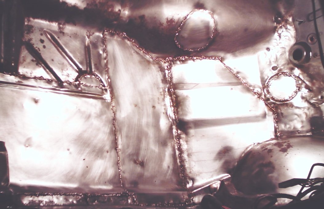 Got the driver's side welded in. I didn't do quite as nice a job forming this sheet. I sort of got it close, tacked it in and beat the crap out of it with a large sledge hammer to form the front of it to the weird shape of the floor pan around there. I also did not try to reproduce the channels like I did on the passenger side. I did kink a couple of diagonal dents with a cold chisel and hammer on the right portion to keep the panel from wobbling.