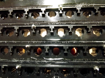 Lay down a bead of model cement into each channel between each row, completely filling them. Keep it neat. Don't get any glue in or around the area where the pivot plate sits. Don't fill the channel higher than the adjacent ridge or it will squirt out. I did this to all of the channels, even the ones that hadn't completely cracked yet.