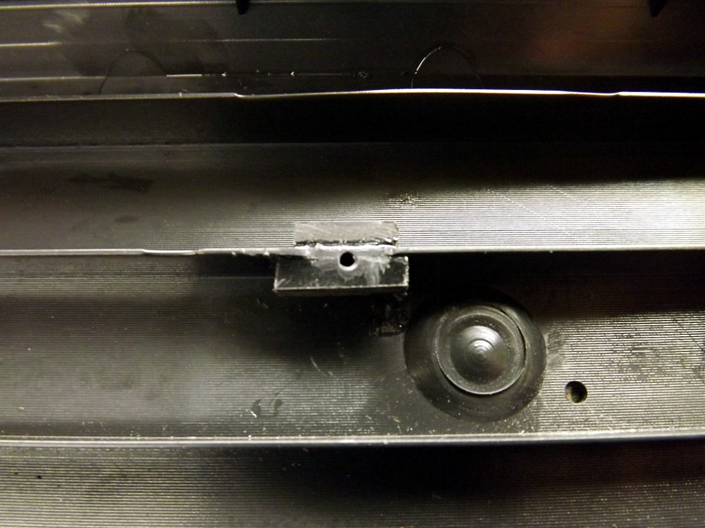 How you support the screw is up to you. You could mount a stud/offset similar to the ones already there. You could also drill completely through the case and use a long screw and nut. I opted to support the area with some scraps of ABS (cut from a Radio Shack project enclosure) welded to the rib in Poker case using Acetone. I then drilled a small 1/16" pilot hole.