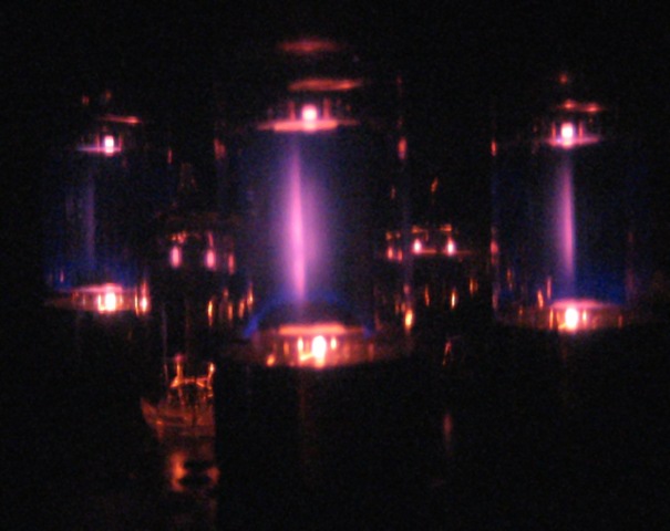 Night shot with the original tubes. Note the blue glow in the output tubes. I have read contradictory discussions about blue glow against the glass envelope. Blue glow coming from inside or near the anode or other structures is normal, but some say that blue glow outside of that means a soft vacuum. Sylvania claims the opposite and that fluorescent glow inside the envelope is normal for some tubes. It results from stray electrons bombarding near the glass envelope and will change in brightness depending on the intensity of the signal passing through the tube. This is exactly what I see with these Philips JAN tubes, which are basically Sylvania. In fact when I push the amp really hard well into cut-off, the tubes will flash brightly signaling me to back-off.